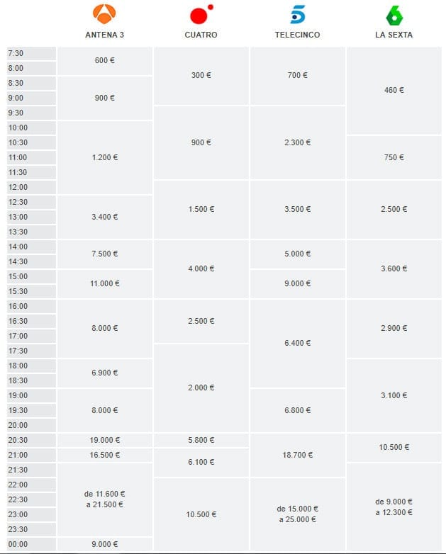 Además del coste de producir el Spot (las grabaciones, actores, montaje, etc.), las cadenas de Televisión cobrarán un precio por emitir el anuncio. Aquí hay una tabla aproximada de los costes: